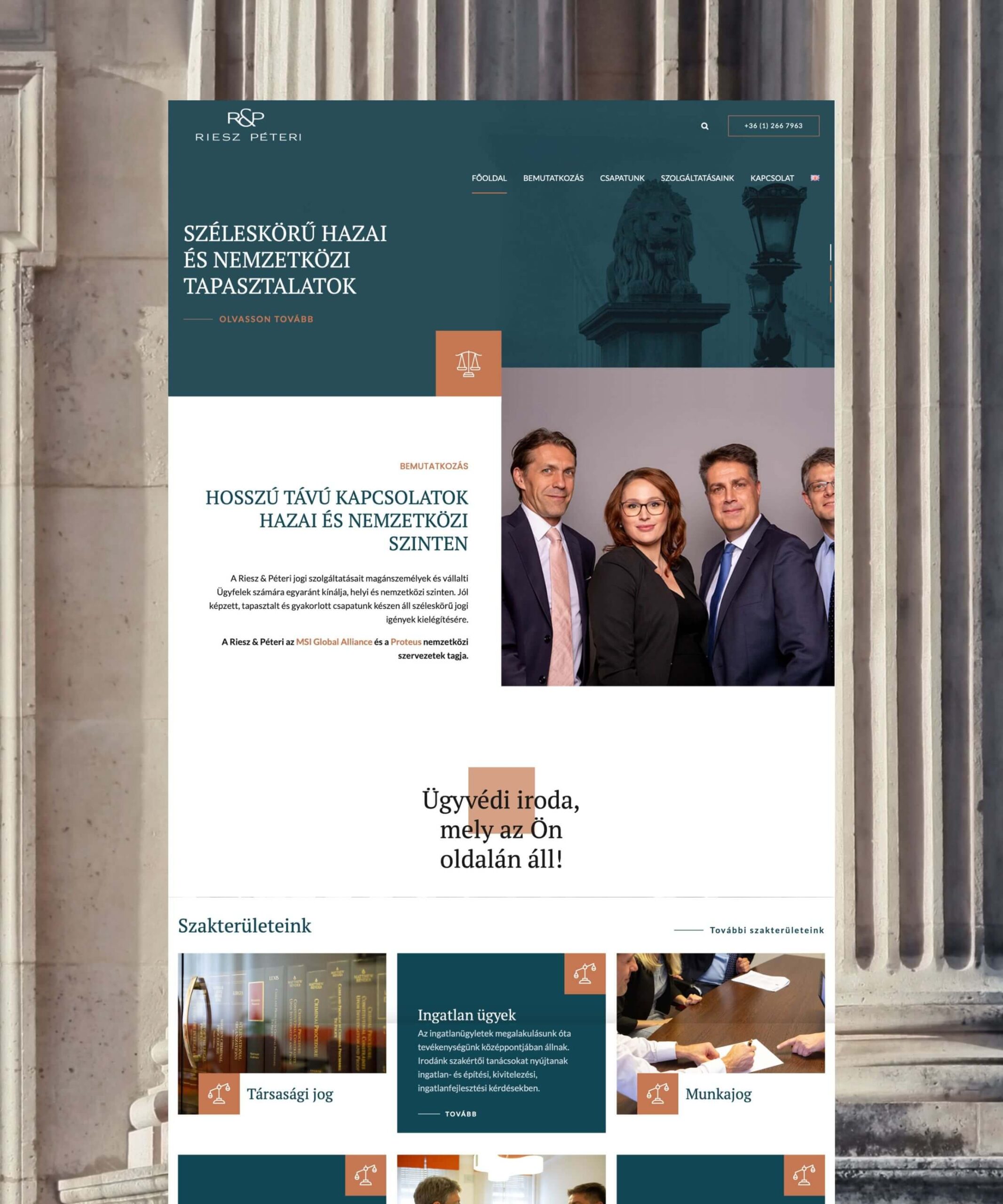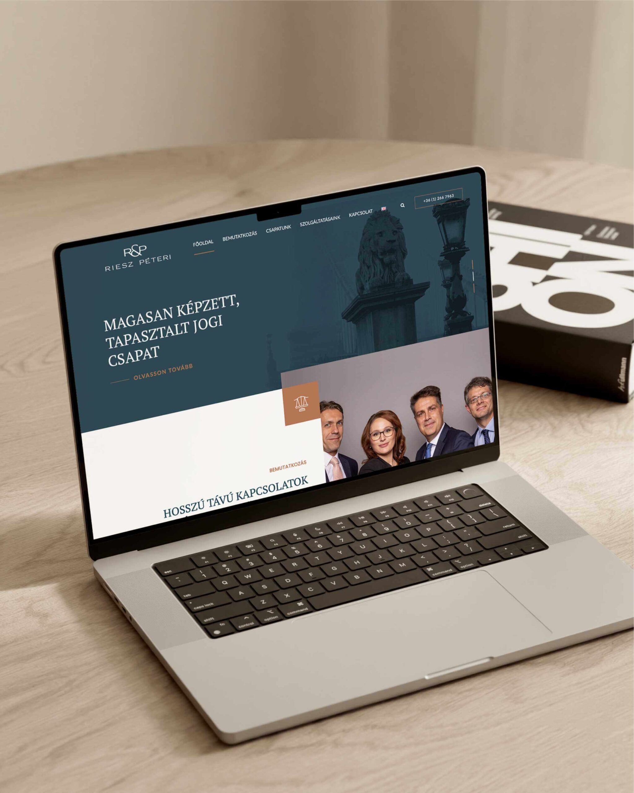 A Riesz & Péteri ügyvédi irodának teljes arculatot és többlapos weboldalt készítettünk. A weboldal felépítése a szakmai hitelességet és az átláthatóságot szolgálja: külön „Bemutatkozás”, „Csapatunk” és „Szolgáltatások” oldalak, a fő szakterületekhez önálló aloldalakkal (pl. társasági jog, ingatlanügyek, munkajog, adatvédelem). A „Kapcsolat” oldalon ügytípus-választó űrlap gyorsítja az első megkeresést. A visszafogott tipográfia és az egységes képi világ az iroda nemzetközi kapcsolódásait is alátámasztja (MSI Global Alliance, Proteus), miközben mobilon és asztali nézetben egyaránt tiszta, könnyen navigálható élményt nyújt.