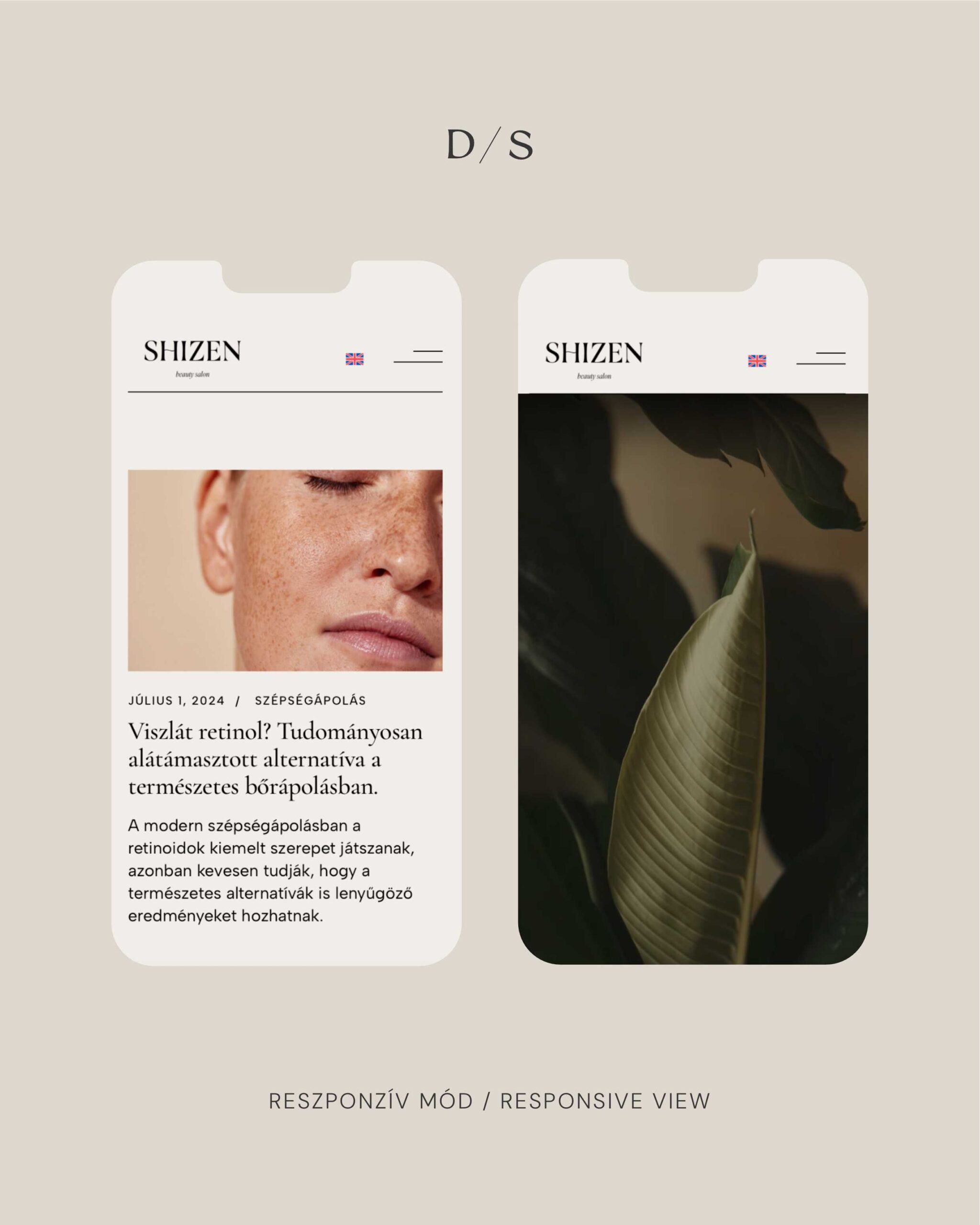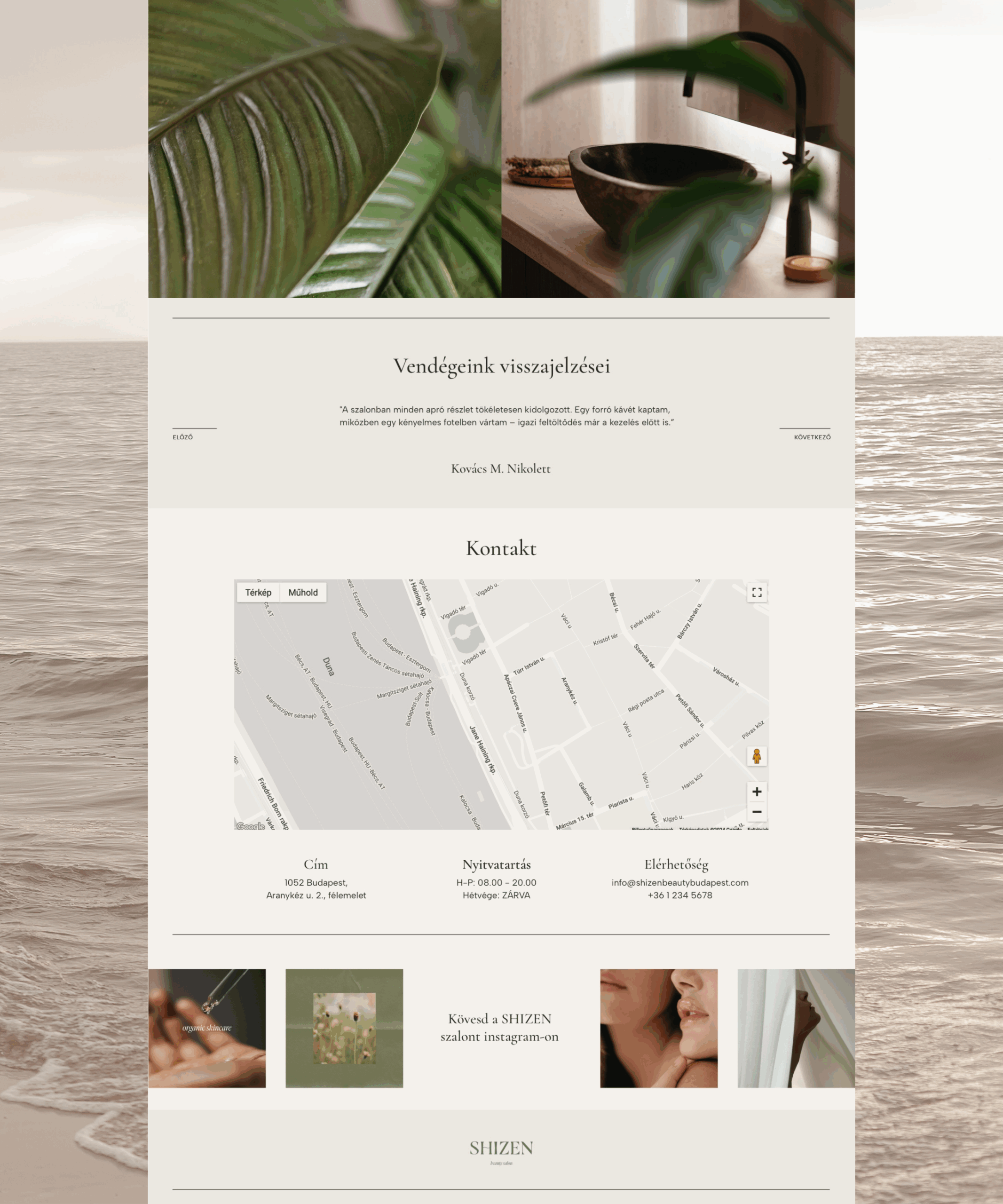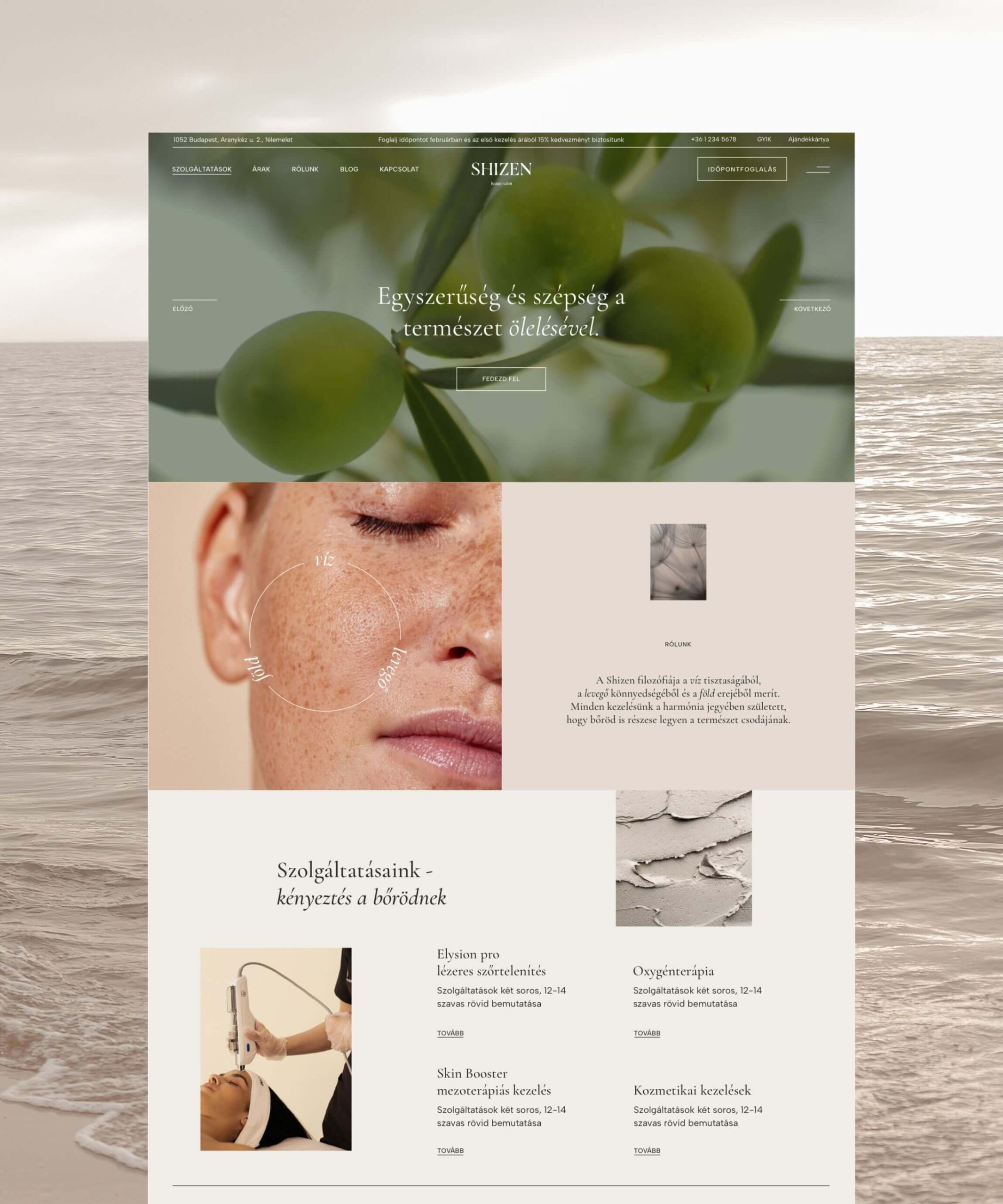 A Shizen Beauty vizuális identitását a logótól az arculati elemekig teljes egészében mi hoztuk létre, így a weboldal minden részlete következetesen ezt a világot tükrözi. A letisztult tipográfia, az elegáns színvilág és a nagy, légies fotók a nyitó videóval kiegészülve érzékletesen adják vissza a szalon természetközeli, nyugodt atmoszféráját.